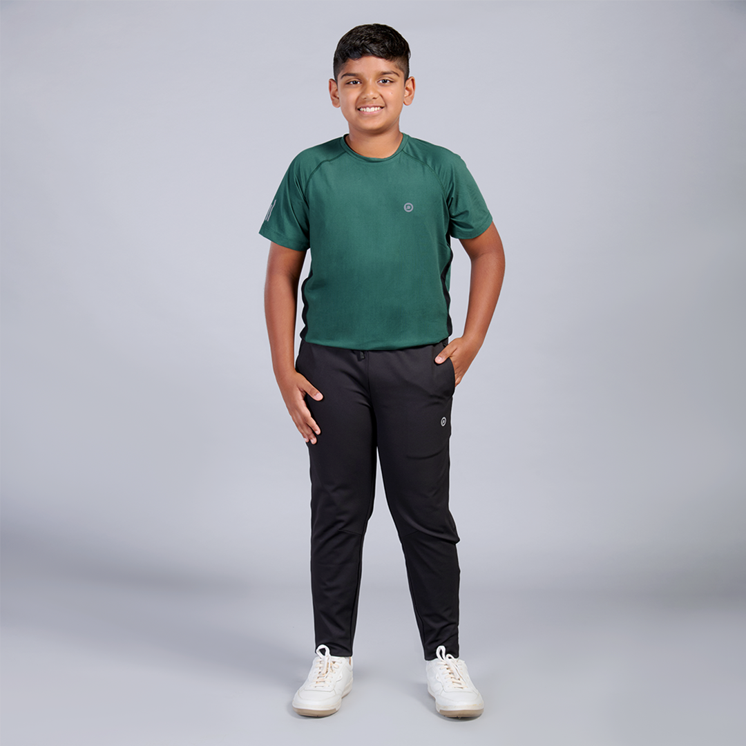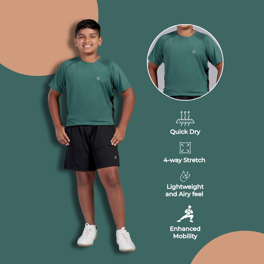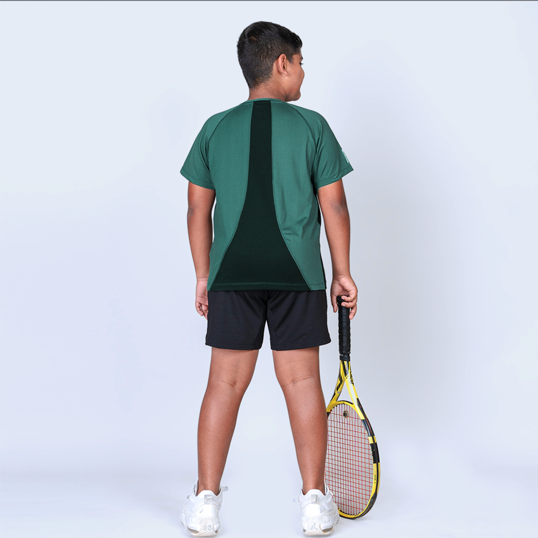 The black, back-panelled dual-toned green tee is great for sunny outdoors when you want your kid to feel bright and soft at the same time. This is a colour off a tender palette of sportswear.