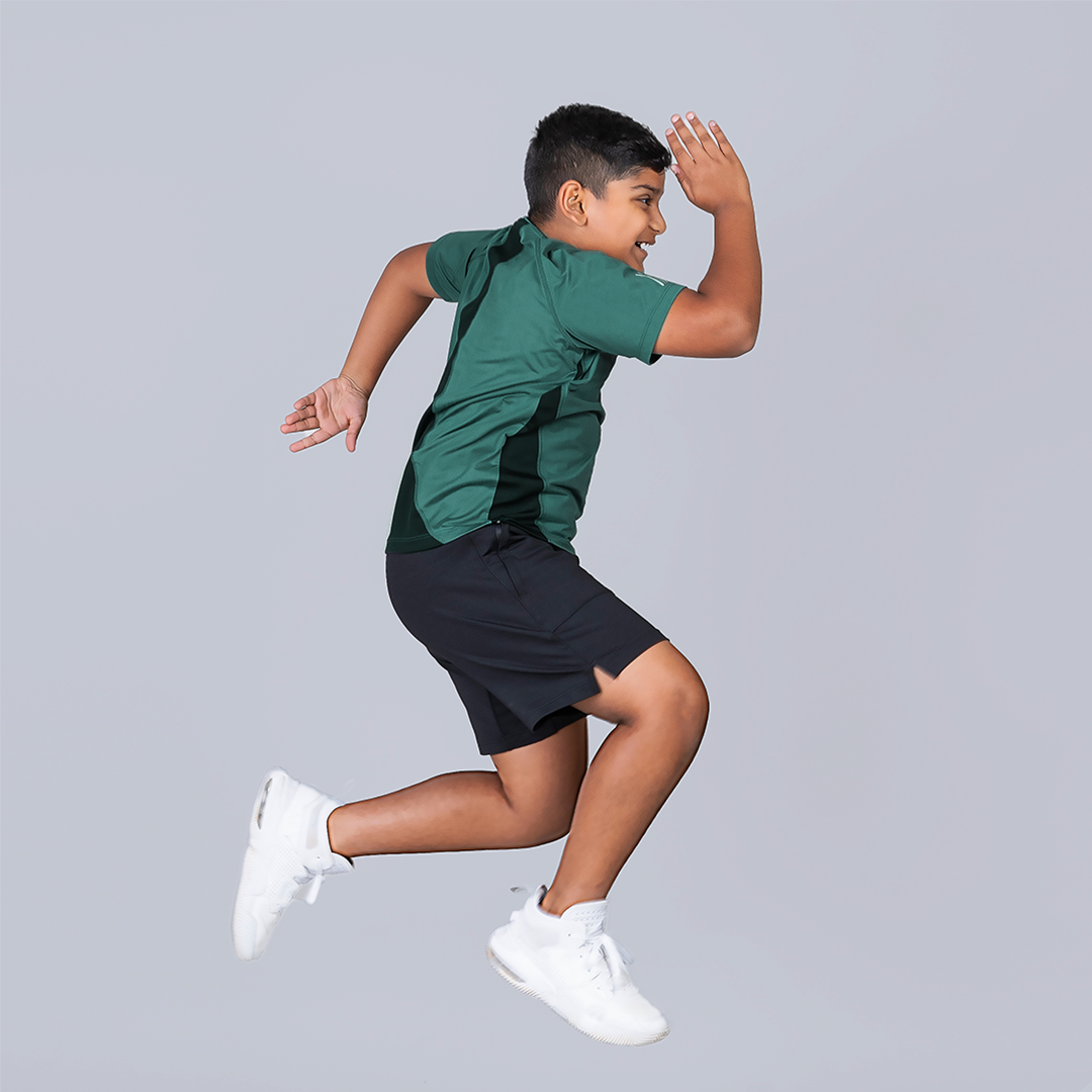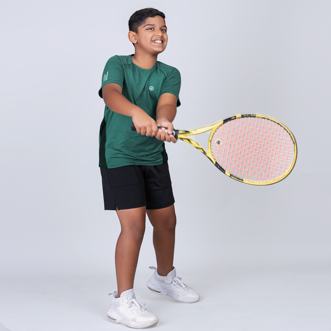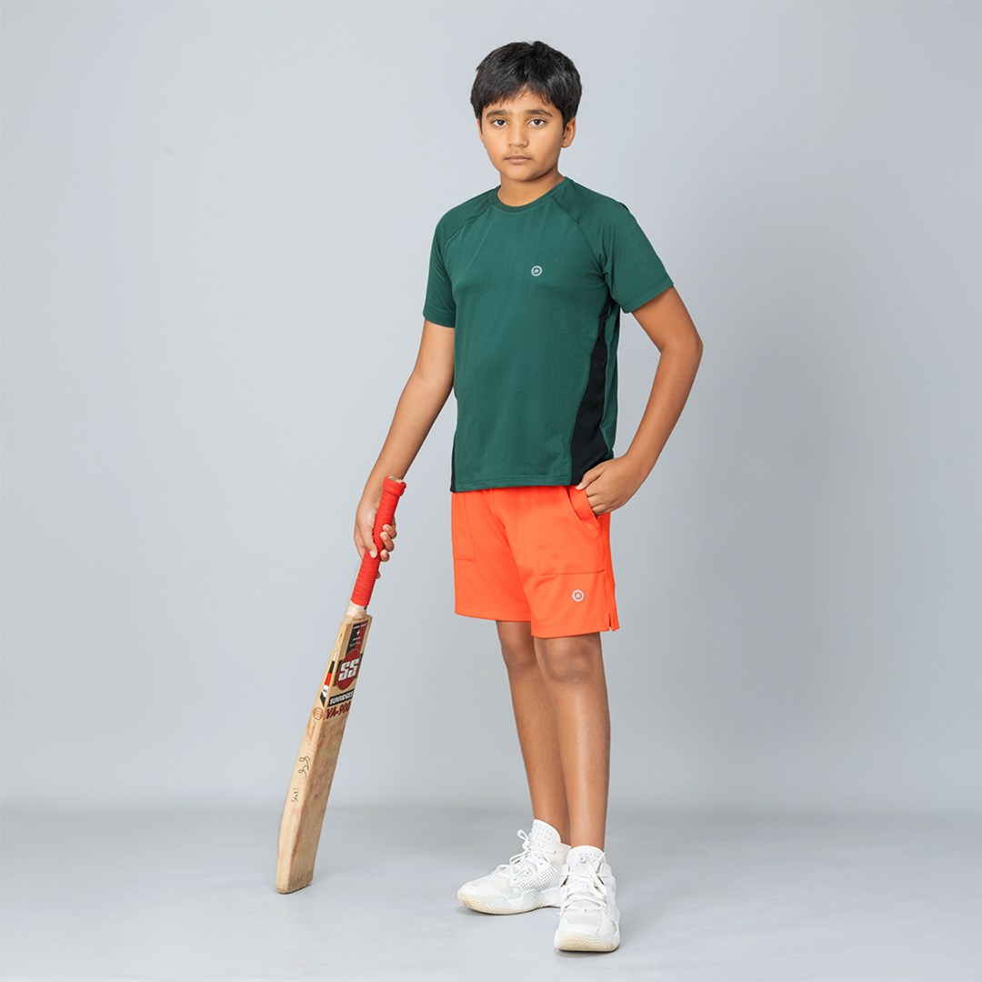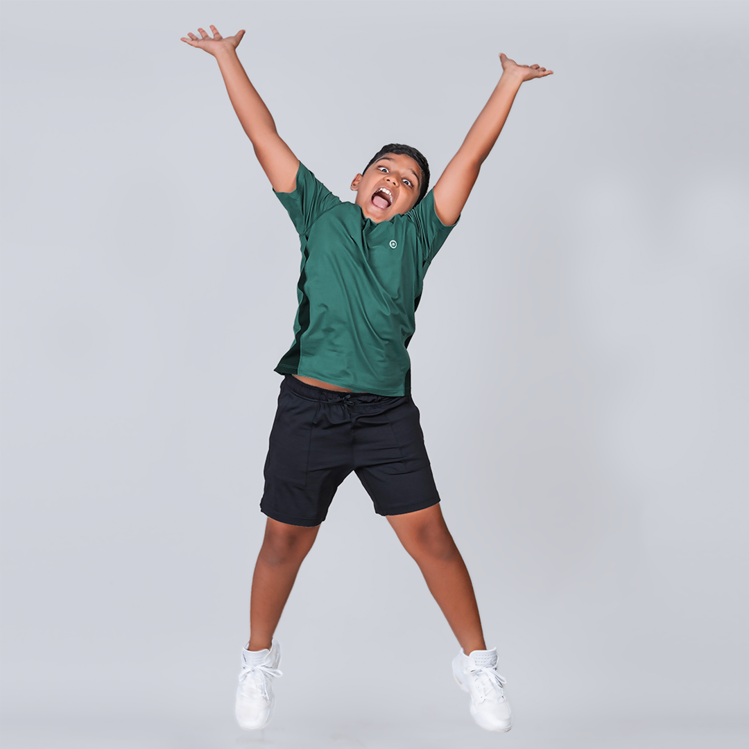 The black, back-panelled dual-toned green tee is great for sunny outdoors when you want your kid to feel bright and soft at the same time. This is a colour off a tender palette of sportswear.