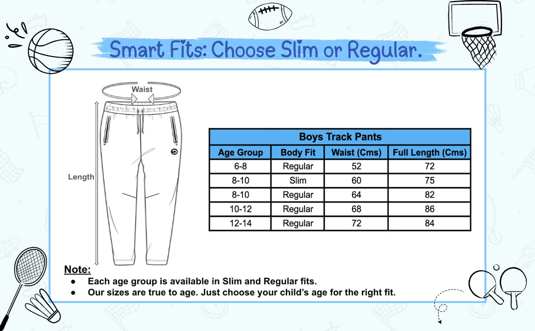| Boys Track Pant | Body Fit | Waist (Cms) | Full Length (Cms) |