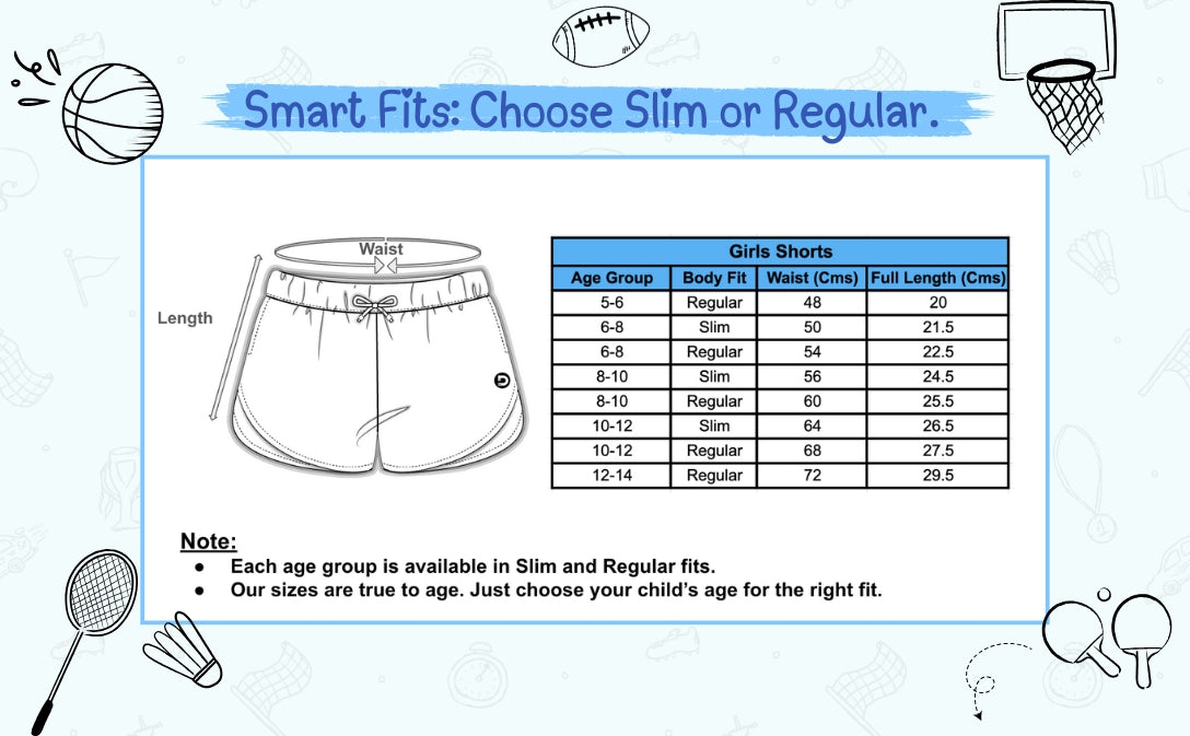 | Girls Shorts | Body Fit | Waist (Cms) | Full Length (Cms) |