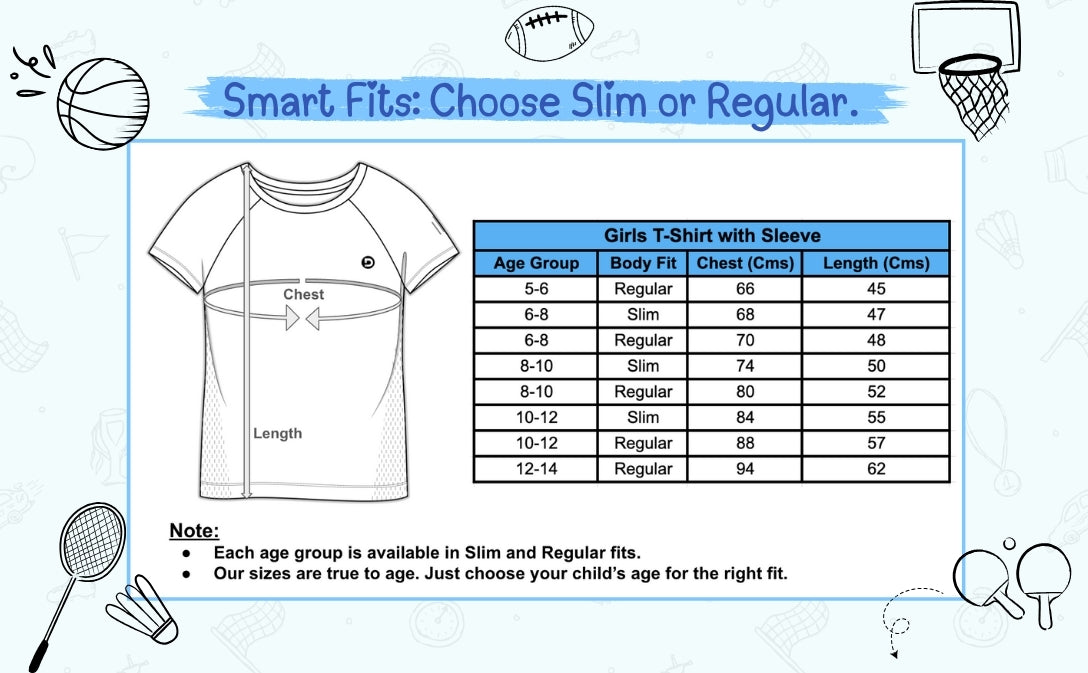 | Girls T shirt | Body Fit | Chest (Cms) | Length (Cms) |